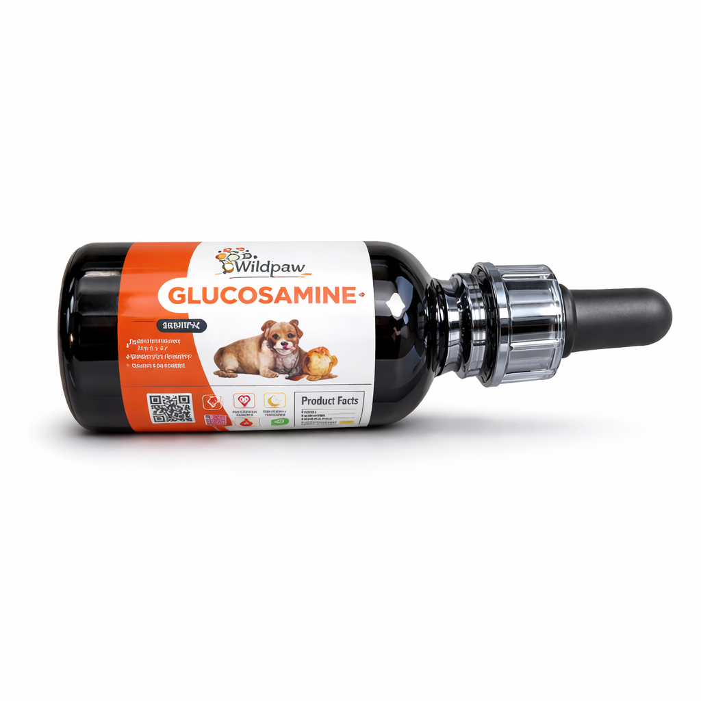 Liquid glucosamine supplement designed to support hip and joint health in dogs. Easy-to-use dropper formula with 30 servings per bottle.