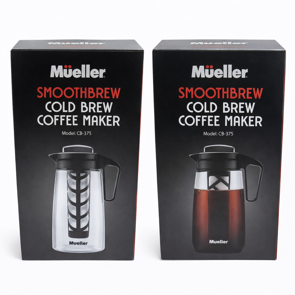 The Mueller SmoothBrew Cold Brew Coffee Maker is designed to create smooth, rich, and low-acid cold brew coffee at home. Featuring a sleek glass carafe and built-in filtration system, it allows for easy brewing and serving of your favorite coffee beverages.