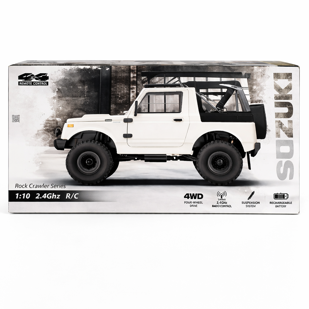 1:10 scale Suzuki Jimny RC rock crawler with 2.4GHz remote and all-terrain performance.