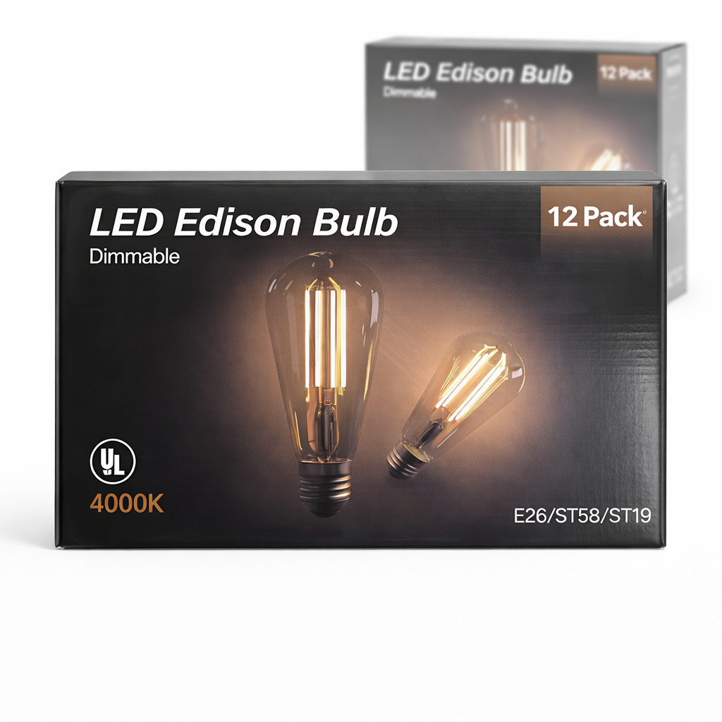 12-pack dimmable LED Edison bulbs with 4000K light, 800 lumens, and long lifespan.